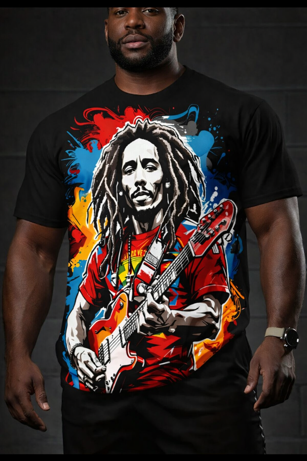Feel the rhythm. Carry the message. This bold graphic tee celebrates the spirit of reggae culture and the timeless influence of legendary music that changed the world. Featuring a striking illustration of a dreadlocked guitarist surrounded by vibrant splashes of red, gold, blue, and yellow, this design captures the soul of freedom, unity, and revolutionary sound.