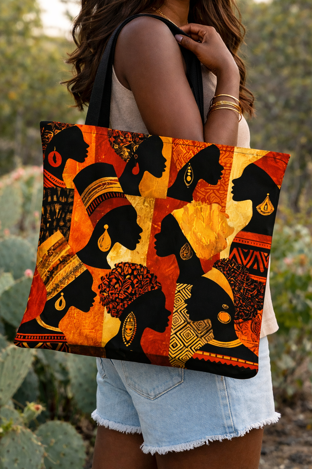 The African Heritage Tote Bag celebrates the beauty, strength, and elegance of African women through vibrant artistic silhouettes and rich cultural patterns. Designed with warm tones of red, gold, and earth colors, this bag brings powerful cultural expression to everyday fashion.